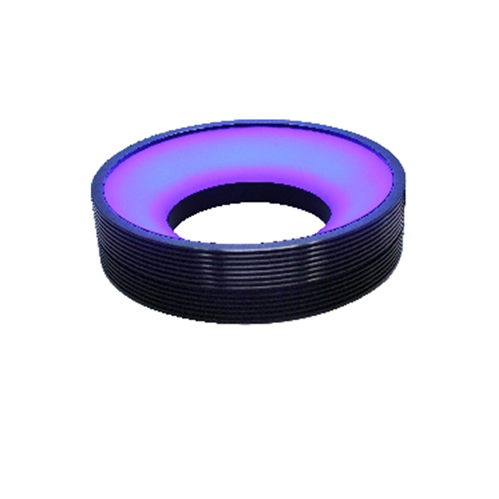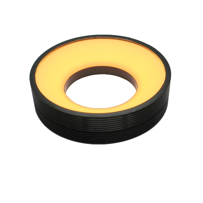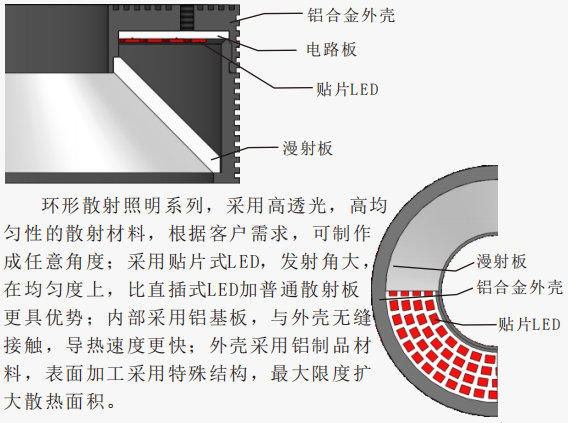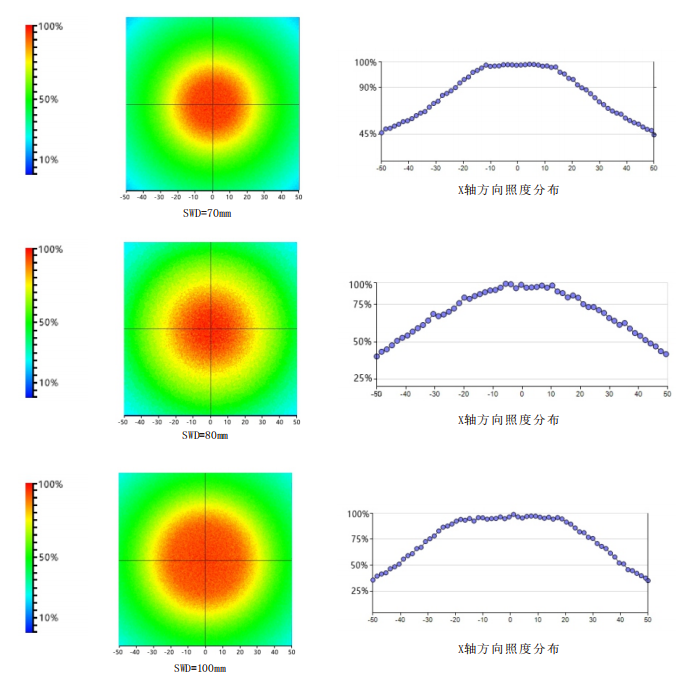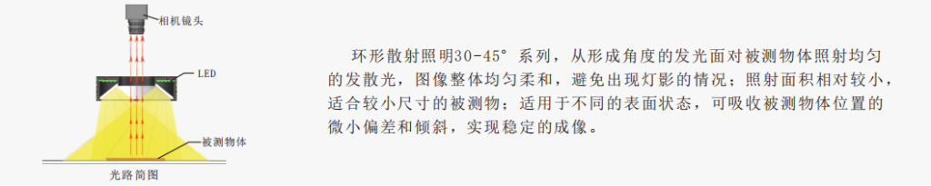 从形成角度的发光面对被测物体照射均匀的发散光,在一定工作距离下,光束集中亮度高、均匀性好、照射面积相对较小;适用于不同的表面状态,可吸收被测物体位置的微小偏差和倾斜,实现稳定的成像。