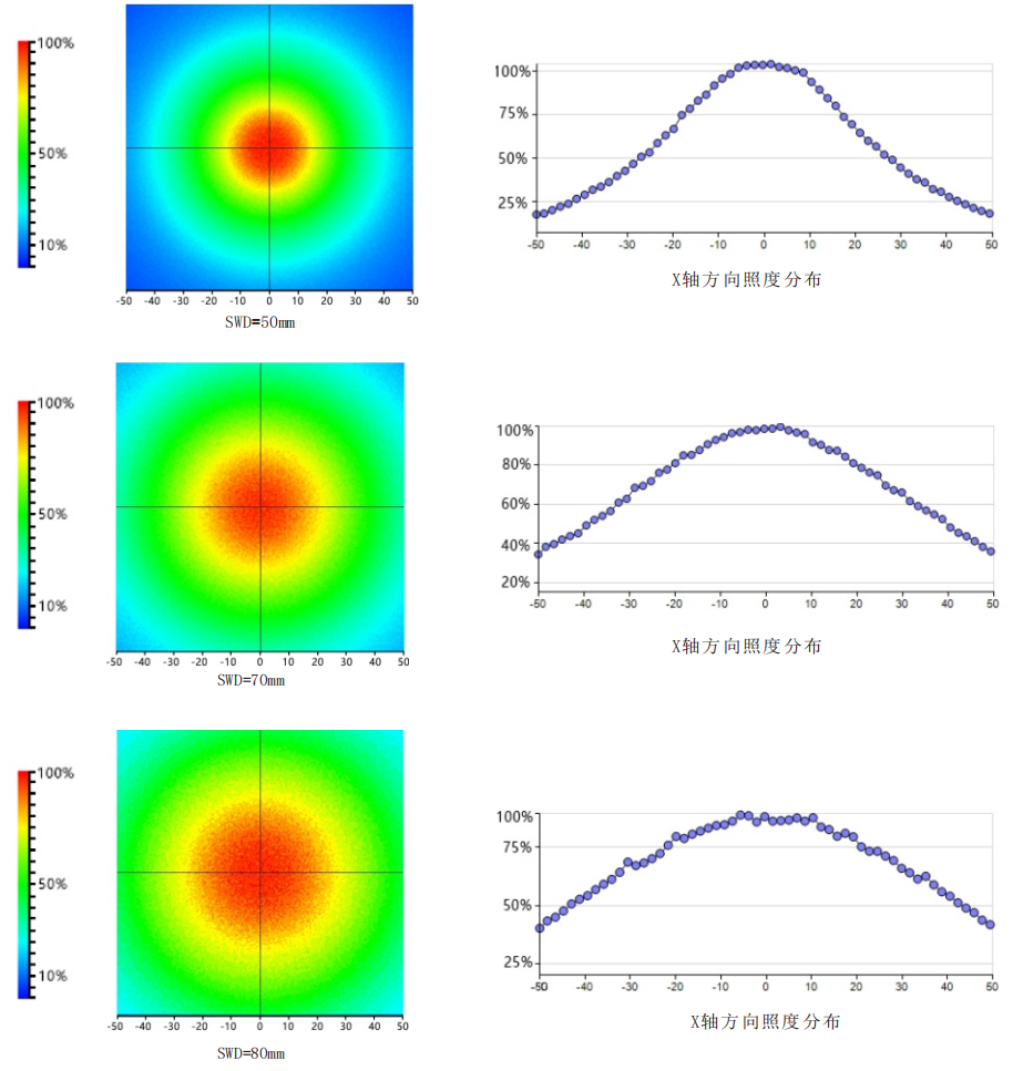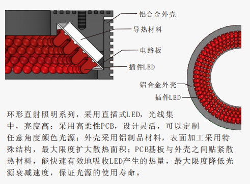 提供不同照射角度,不同颜色组合,在一定工作距离下,光束集中亮度高、均匀性好、照射面积相对较小。可解决对角照射阴影问题,突显成像特征。