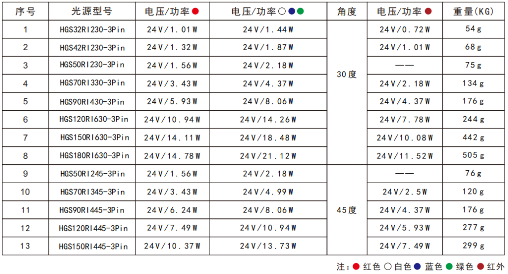 照射角度、外形尺寸、安装孔位、亮度、波长、色温。