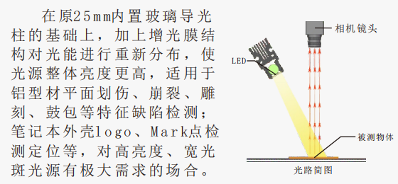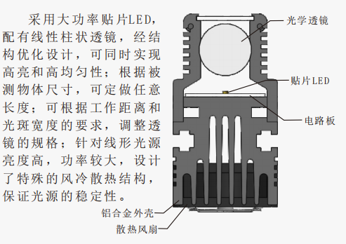 采用大功率高亮L E D,经特殊聚光结构形成一条高亮度、高均匀性的光带,通常采用侧向照射或底部照射,配合线阵相机获得高质量的图像。适用于各种大幅面、流水线连续检测场合。