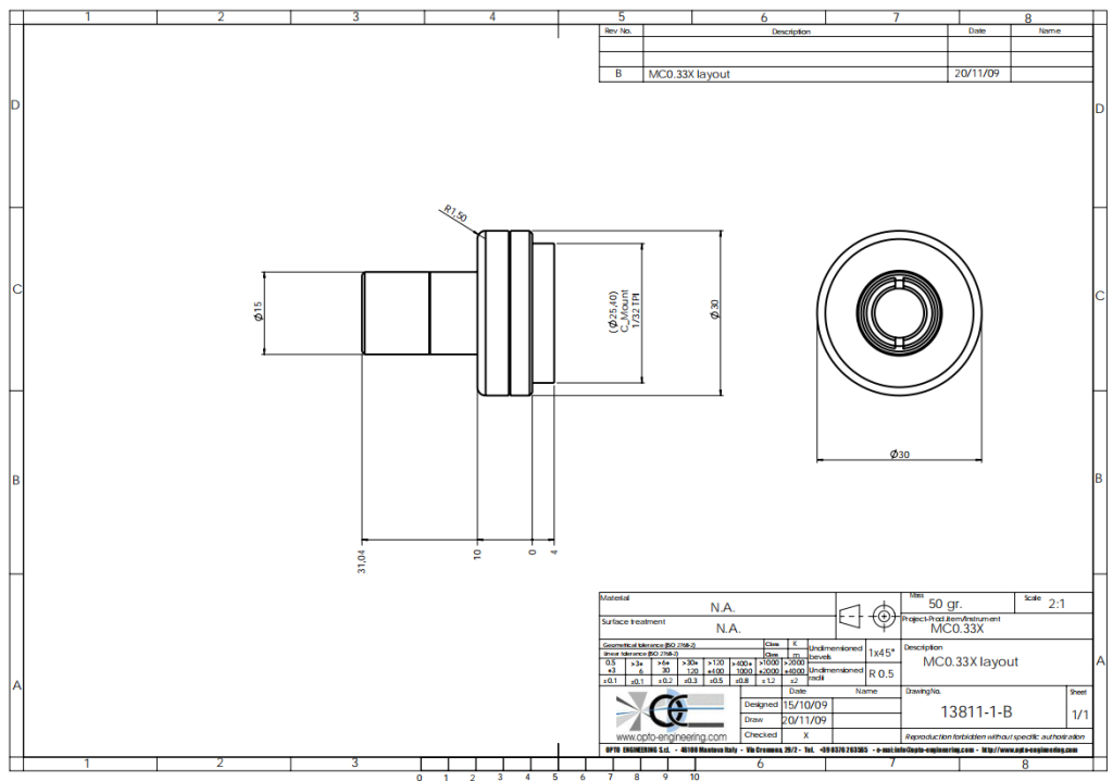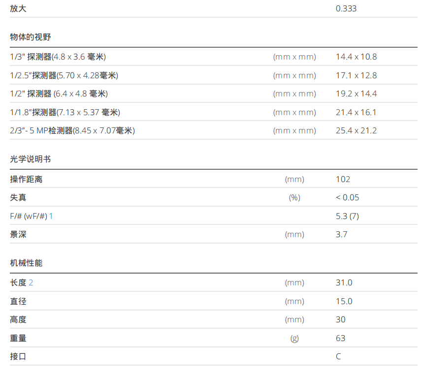适用于2/3″尺寸的微距镜头, 放大倍率:0.33 x, C接口