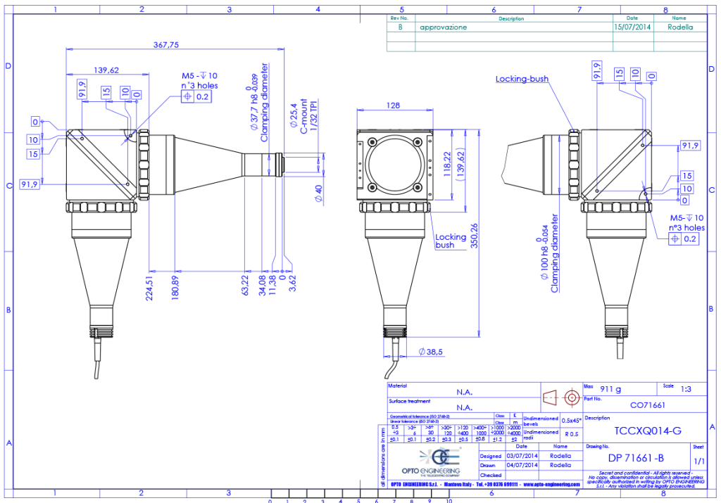 Telecentric assembly with coaxial illumination for 2/3″ detectors, magnification 0.14x, green