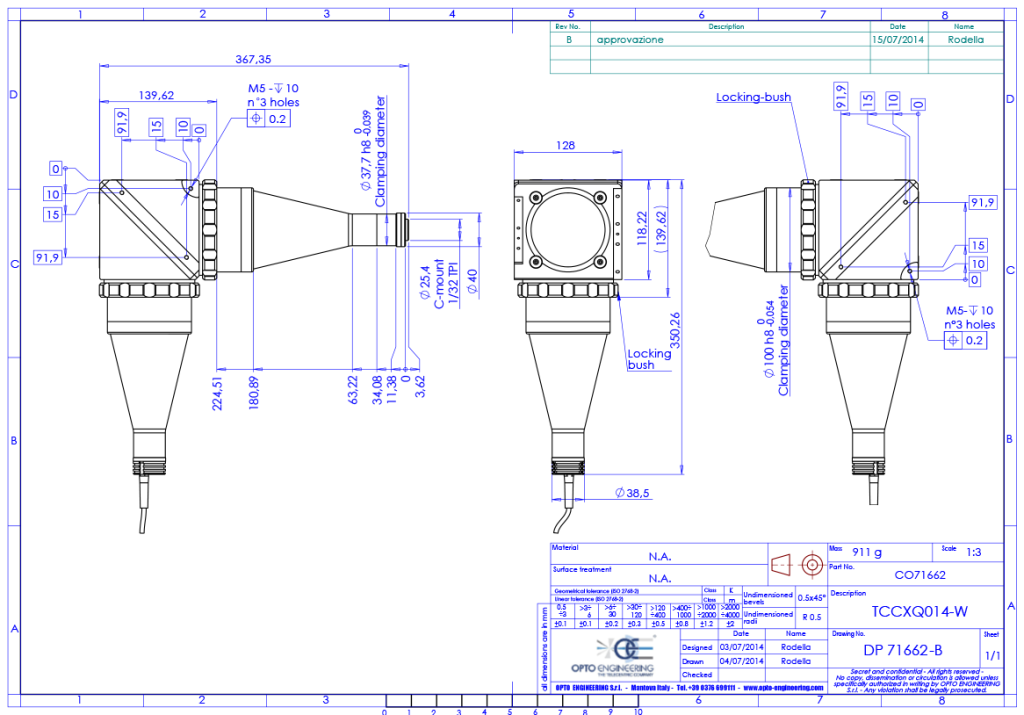 Telecentric assembly with coaxial illumination for 2/3″ detectors, magnification 0.14x, white