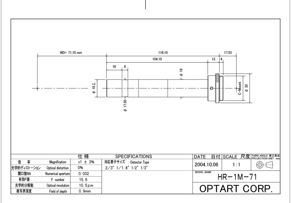 用于2/3”探测器的1x远心镜头,工作距离71mm。