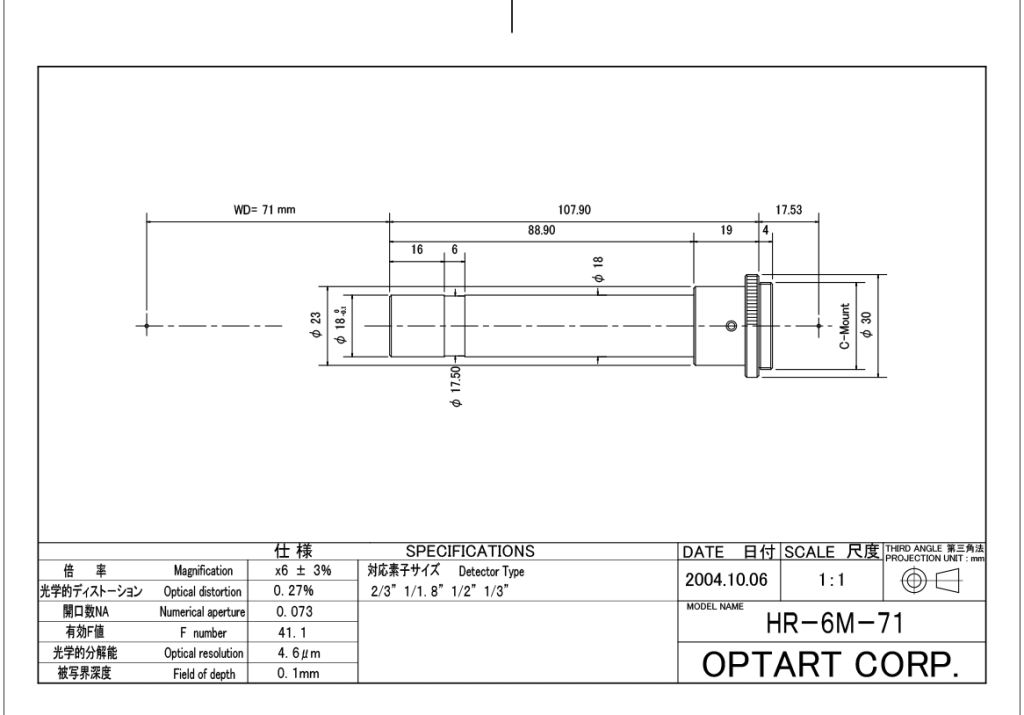 用于2/3”探测器的6x远心镜头,工作距离71mm。