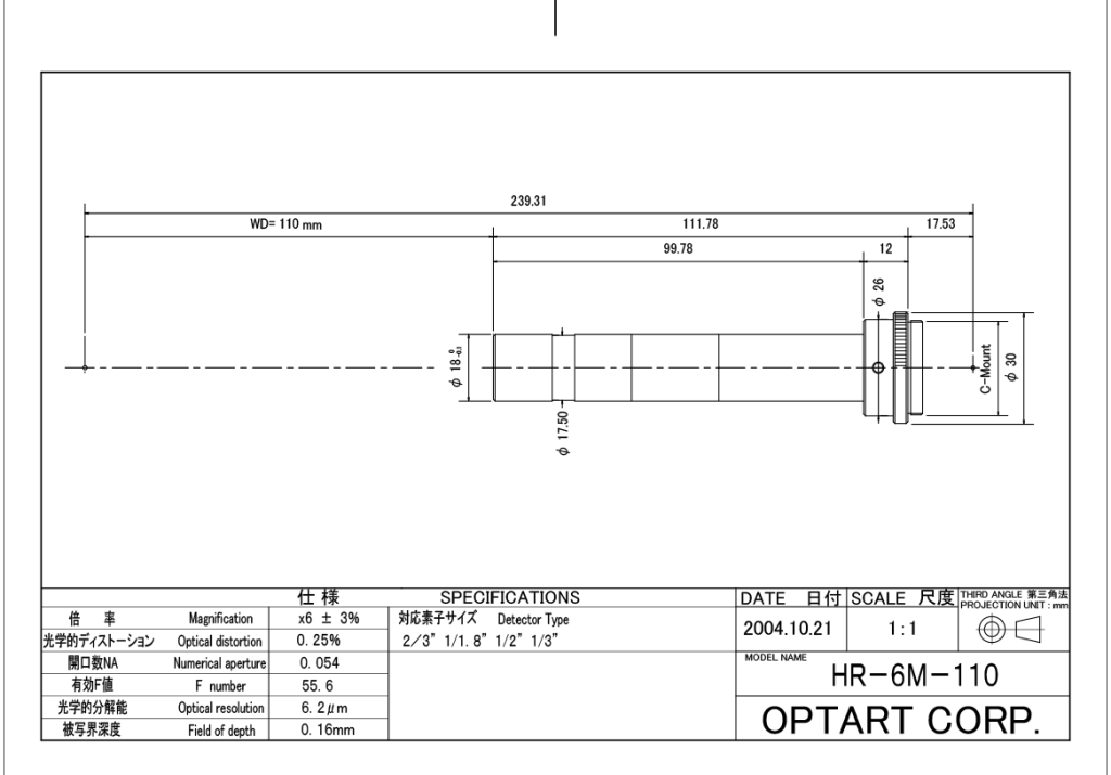 用于2/3”探测器的6x远心镜头,工作距离110mm。