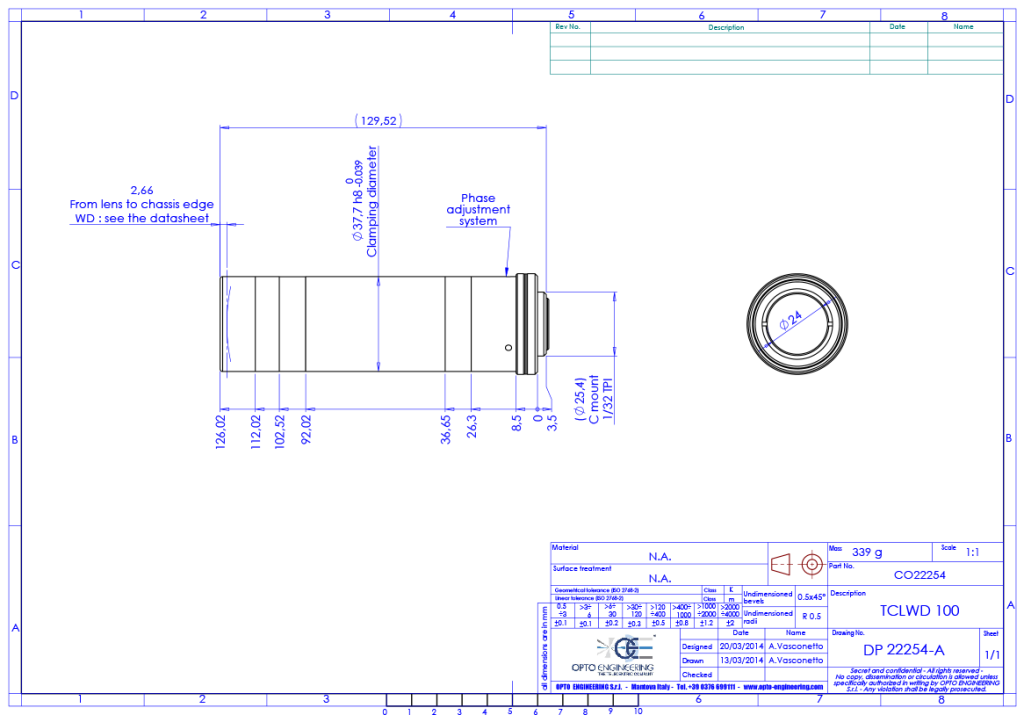 Long working distance telecentric lens for 2/3″ detectors, WD 135 mm, magnification 1.00x, C-mount