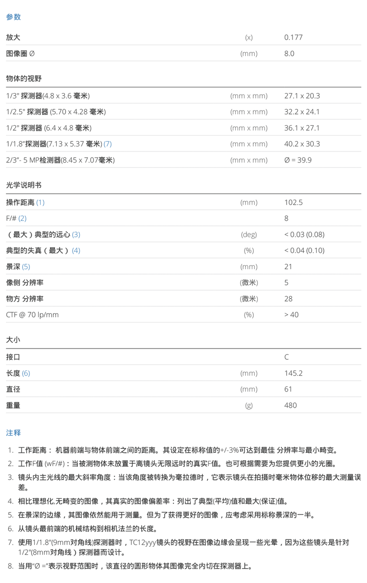 适合于1/2″探测器的双远心镜头,放大倍率:0.177 x,C接口
