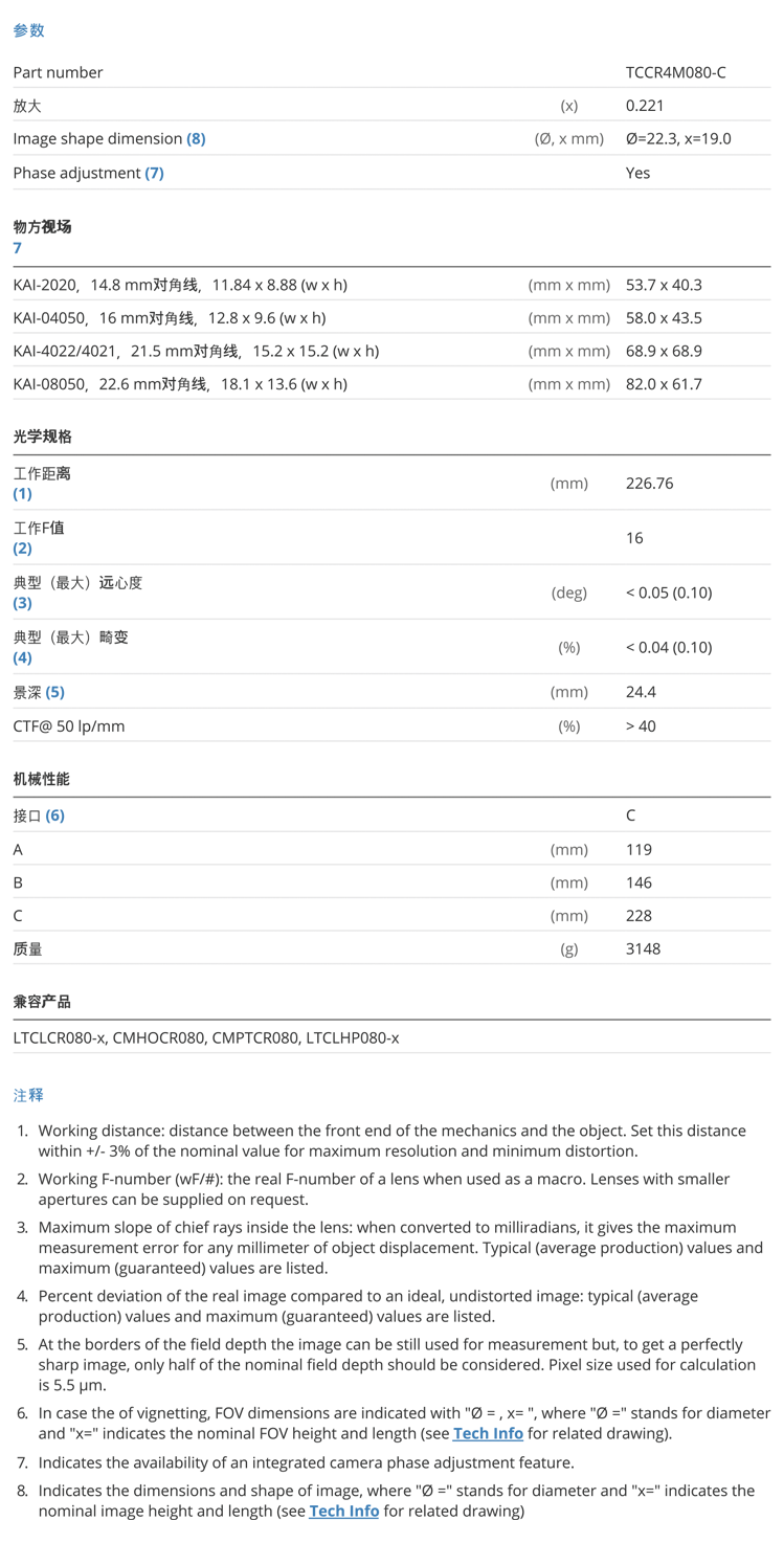 CORE系列远心镜头,适用于4/3”探测器,放大倍率0.221 x,C接口