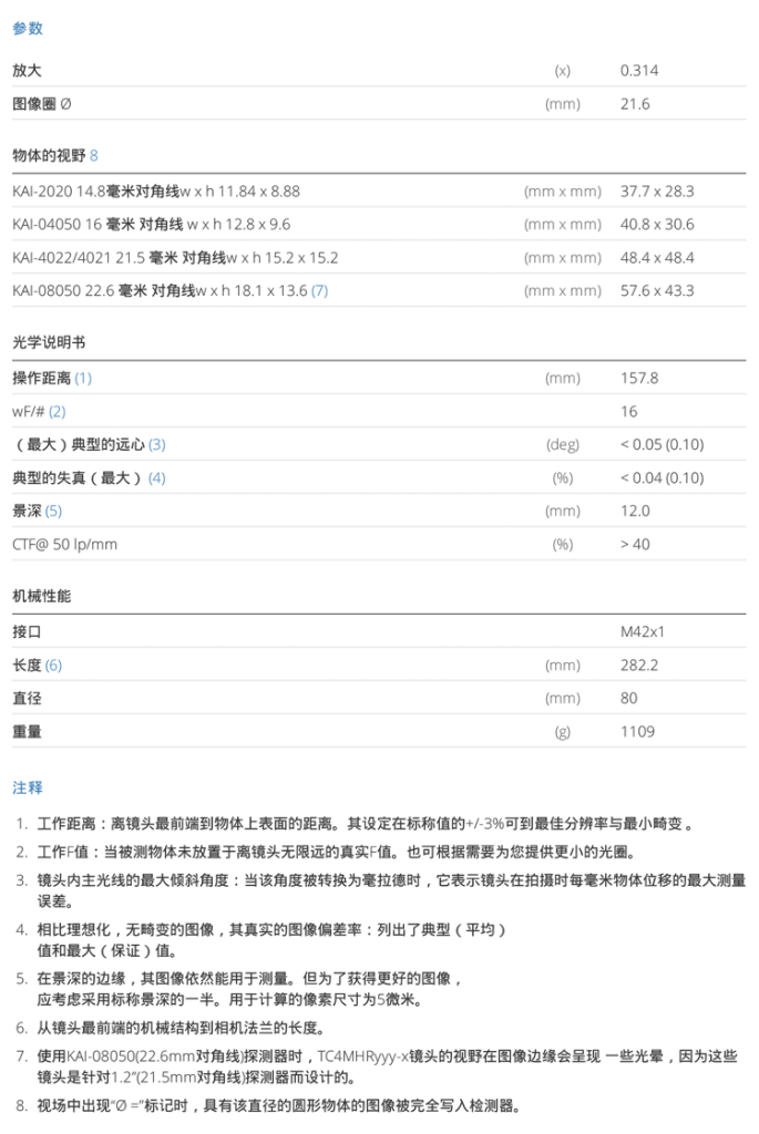 High resolution telecentric lens for 1.2″ detectors, magnification 0.314x, mount M42X1 FD=16