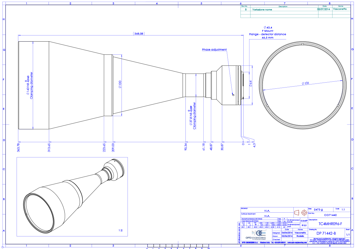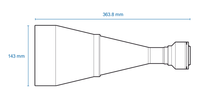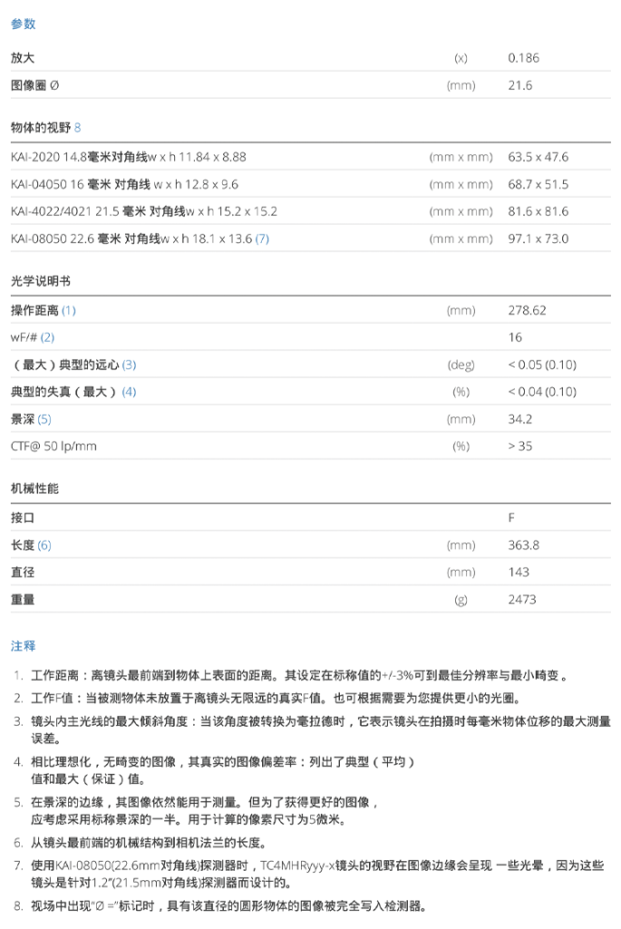 High resolution telecentric lens for 1.2″ detectors, magnification 0.186x, F-mount